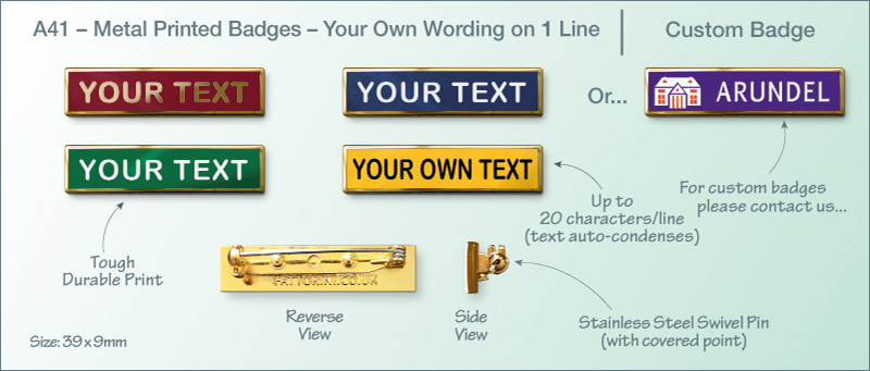 A traditional styled metal printed rectangular shaped badge with a modern twist. The text is printed in black or white, depending on the background colour. If you require metallic printed text this is an option too at a small premium. Be mindful that metallic paint will not appear as shiny as metal. If this is important to you then we suggest you choose a standard title of one of our traditional metal enamel badges (bespoke titles are possible but will require bespoke tooling at a cost).