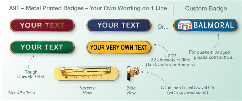 A traditional styled metal printed oblong shaped badge with a modern twist. The text is printed in black or white, depending on the background colour. If you require metallic printed text this is an option too at a small premium. Be mindful that metallic paint will not appear as shiny as metal. If this is important to you then we suggest you choose a standard title of one of our traditional metal enamel badges (bespoke titles are possible but will require bespoke tooling at a cost).