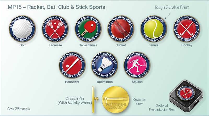 MP15 “Racket, Bat, Club, Stick” Sports badges + 2 lines text
