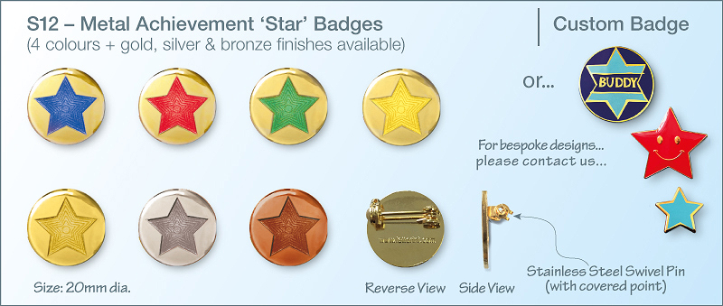 These fun badges can be used in conjunction with our STS12 stickers as part of a motivational system. The metal badge version can be awarded once a sticker milestone has been reached.