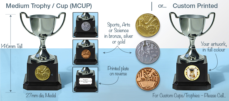 The trophy can be plain, but for simplicity we have designed these to accomodate the gold, silver and bronze Achievement Badges for Arts, Sciences or Sports style. Each style & finish is shown above.
